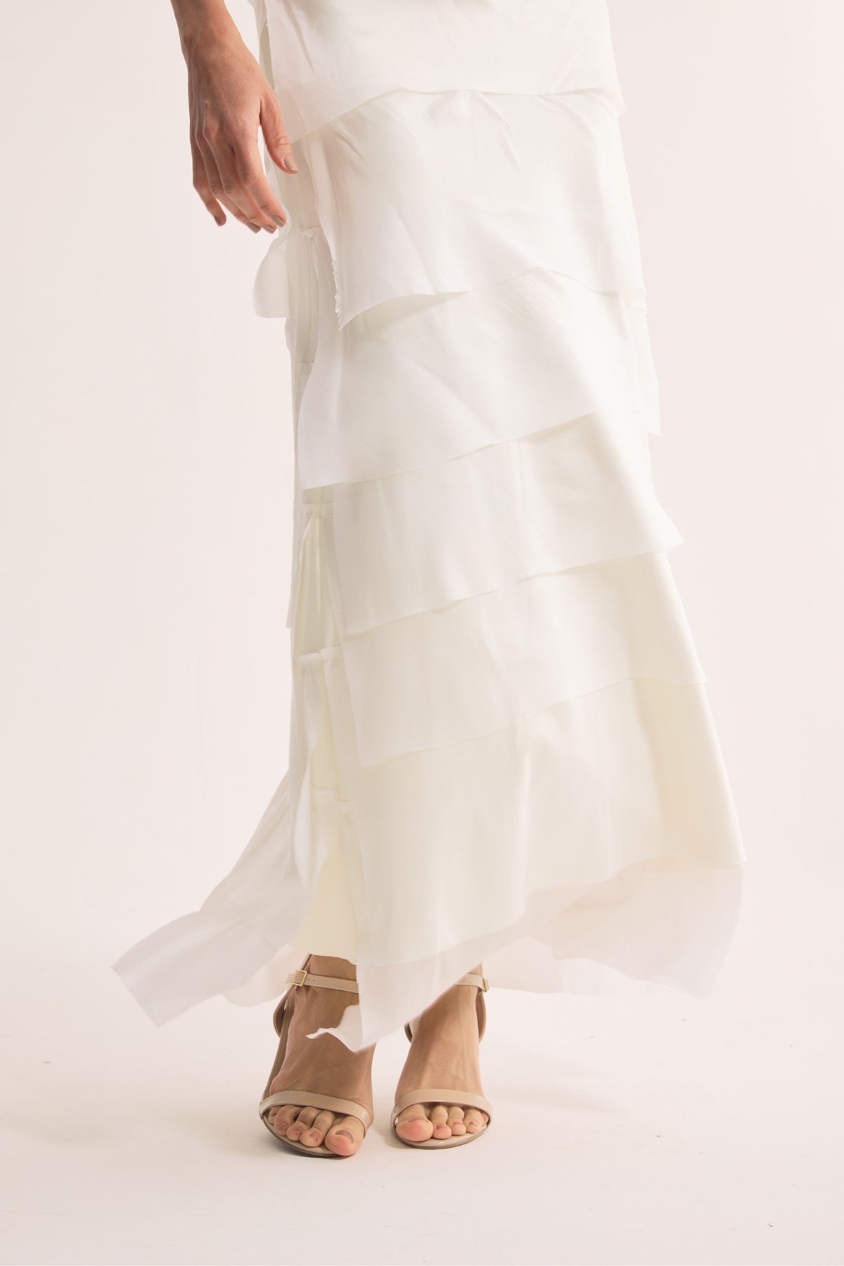 Saia longa desenvolvida em seda com caimento leve e movimento fluido. A modelagem em camadas cria volume sutil e delicado, evocando o desenho natural das dunas moldadas pelo vento. Possui forro em malha de meryl, garantindo conforto e segurança ao vestir. Uma peça etérea e elegante, inspirada na suavidade das paisagens naturais.